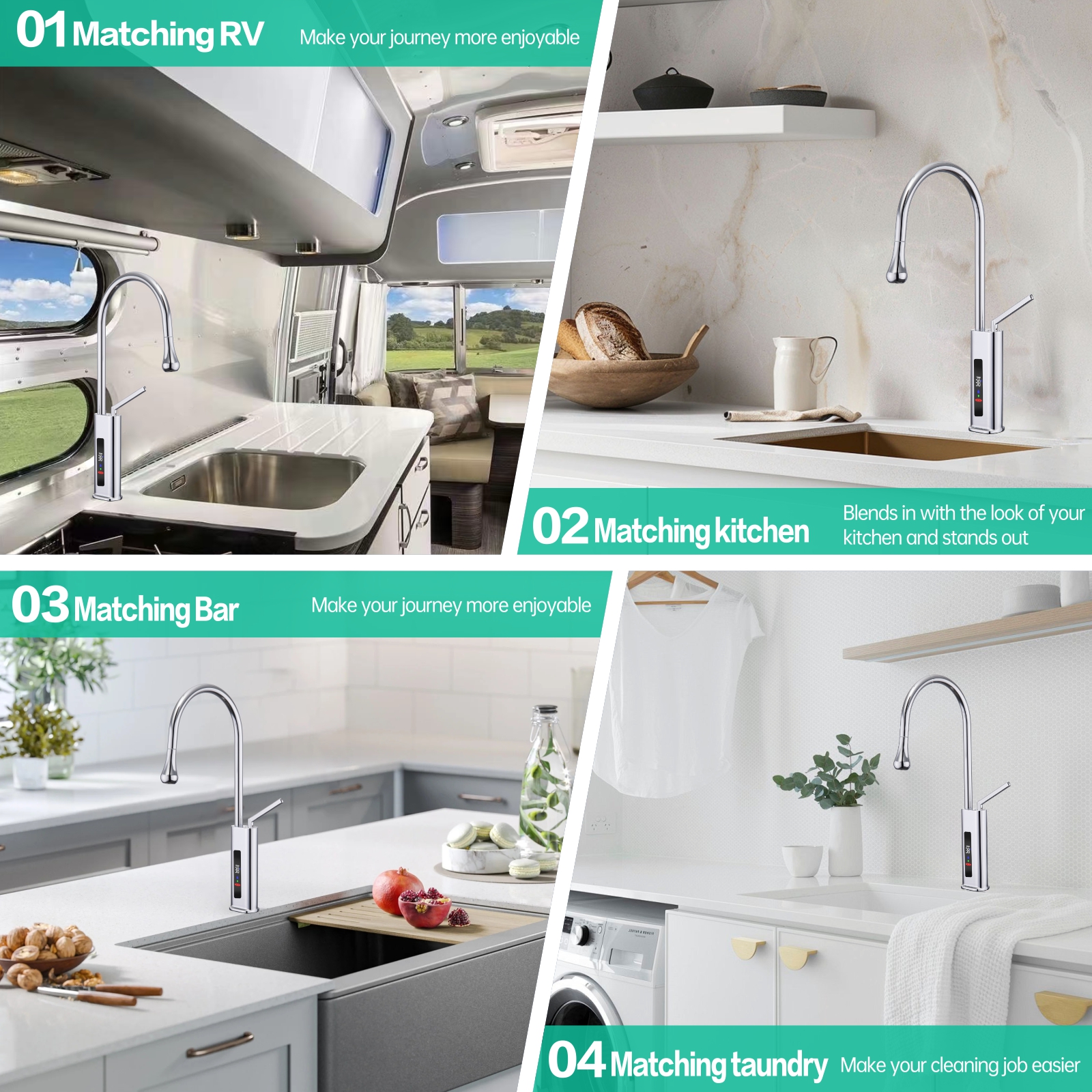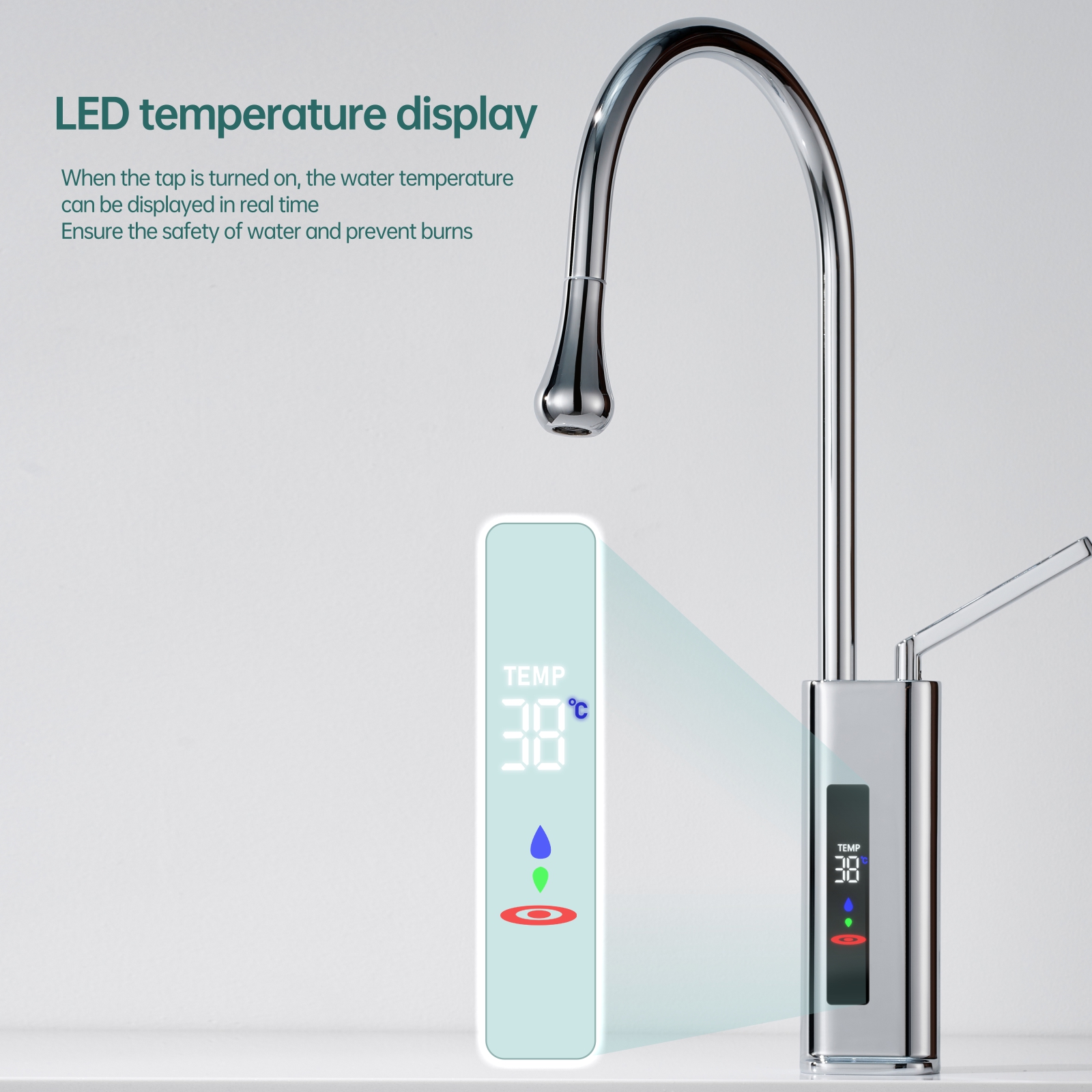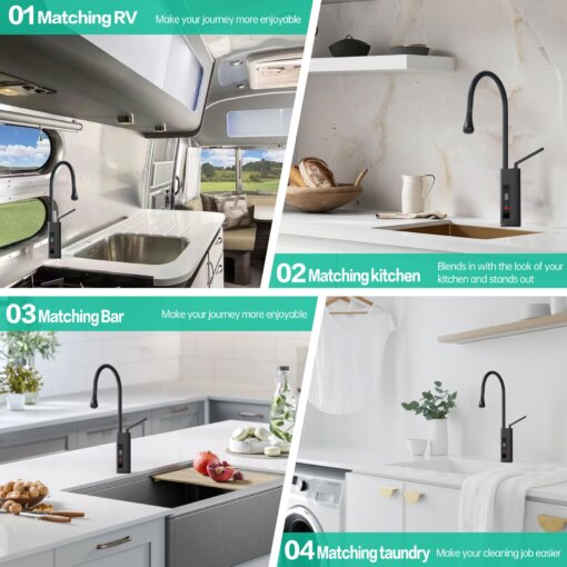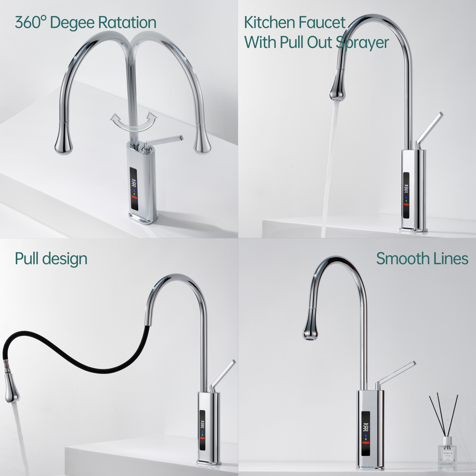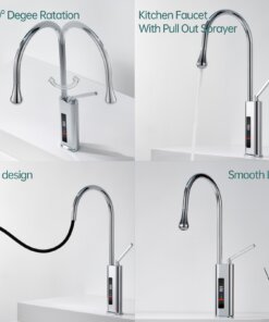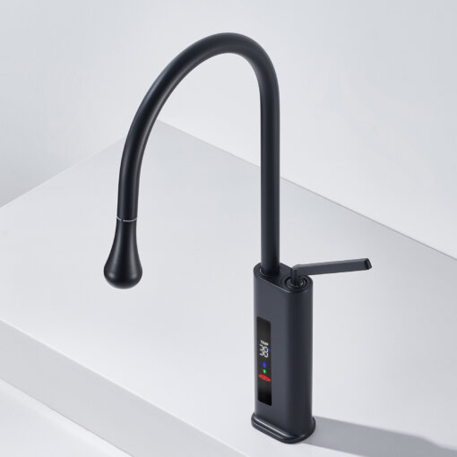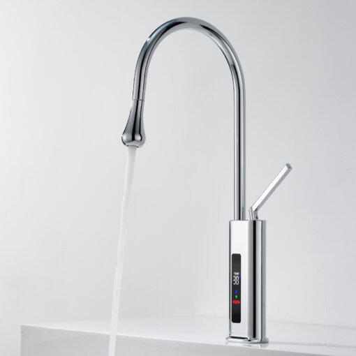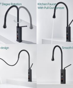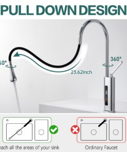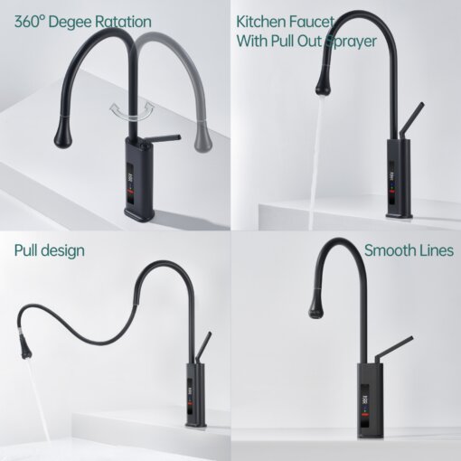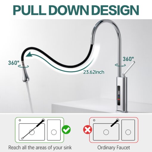 his 360° swivel kitchen faucet with an LED temperature display integrates modern technology with sleek design, making it perfect for use in kitchens, bars, RVs, and other spaces. The 23.62-inch pull-out hose provides superior flexibility, allowing you to easily clean every corner of the sink. The real-time LED screen ensures water safety by displaying the current temperature, preventing accidental burns.